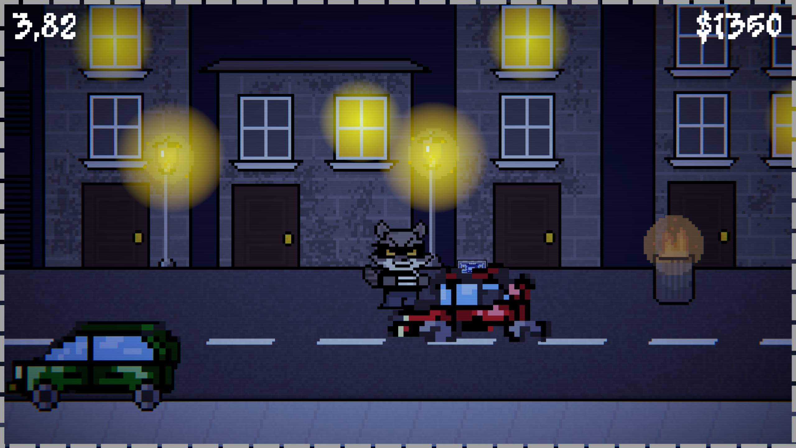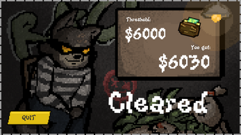 A very short beat 'em up where you play as a racoon goon trying to steal enough valuables and cash to afford medicine for his family. You beat up everyone and everything you find along the way. Take cash from random pedestrians and steal radios from cars to meet the threshold of $6000 and win.